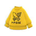 The Squidmark Sweat is a top item in Animal Crossing: New Horizons introduced in the 3.0 Free Update. The item can be worn by either the player or any villagers. When it is put on, a small snippet of "Clickbait" from Splatoon 3 plays. This item is based on the Squidmark Sweat gear from Splatoon 3.